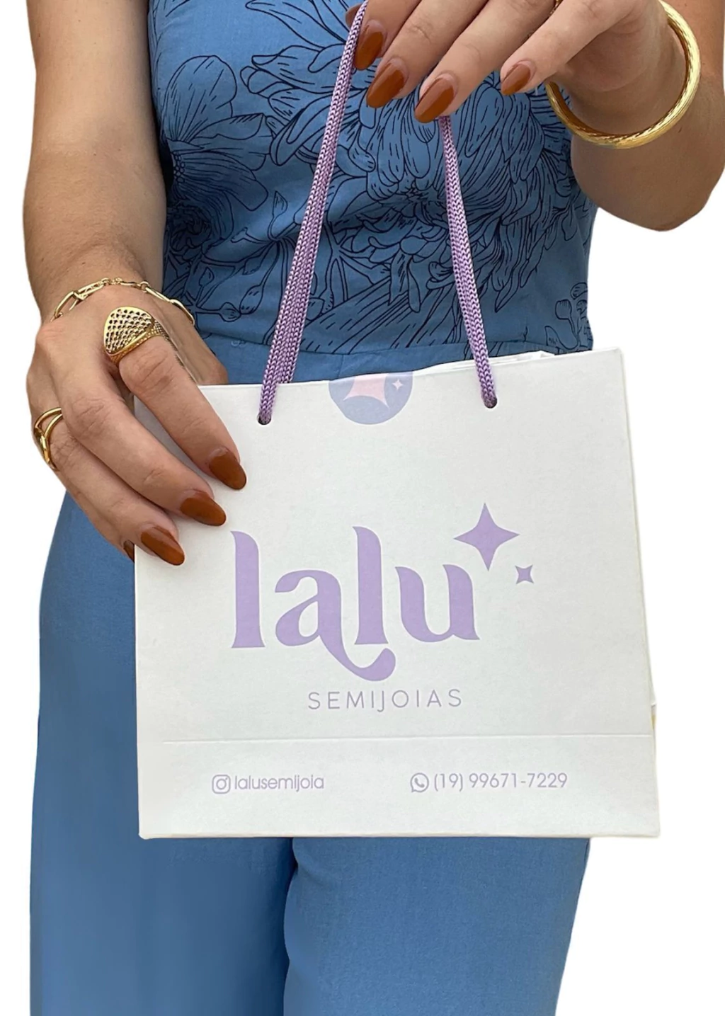 - 1 embalagem: do tipo sacola branca, com a logo Lalu estampada na cor lilas, alças da sacola também em lilas.